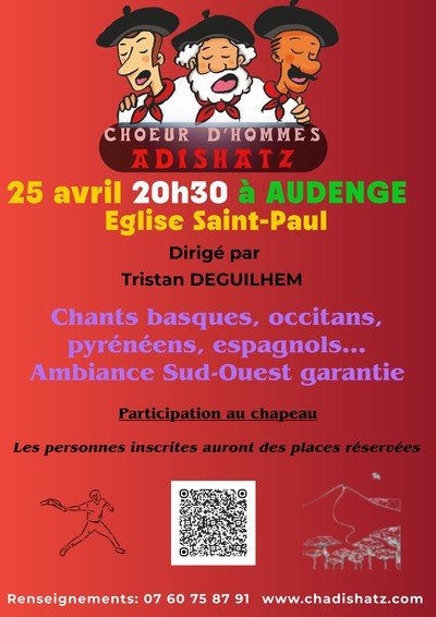 Venez vibrer au son des voix puissantes du chœur d’hommes ADISHATZ. Plus qu’un concert, c’est une invitation au voyage, des sommets pyrénéens aux côtes basques, en passant par la chaleur de l'Espagne.