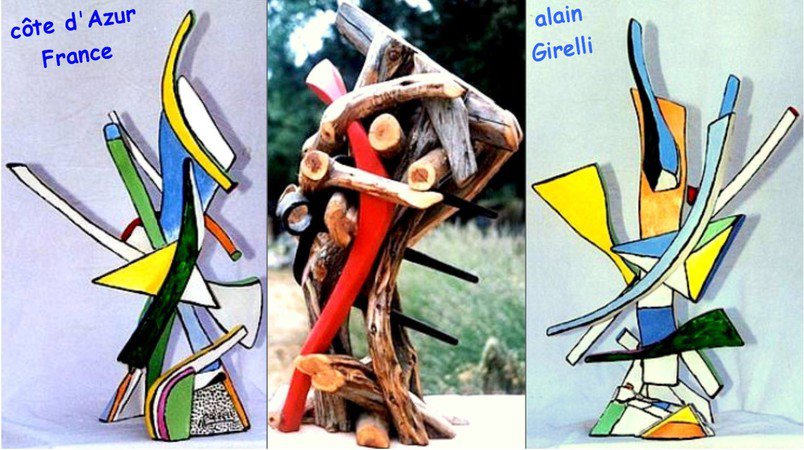 En quelques mots: Artiste autodidacte, établi à Fayence, qui a découvert la sculpture avec Max Ernst et travaillé dans son atelier à compter de 1970. A partir de matériaux divers - bois, de cade en particulier, pierre, béton ou acier selon les périodes, Alain Girelli a réalisé une œuvre polymorphe, d'une grande inventivité, toujours marquée par une recherche dynamique de l'équilibre des lignes de force et des masses. Ses réalisations - meubles-sculptures, figures, assemblages, totems ou sculptures monumentales - sont présentes dans de nombreuses collections privées et publiques. Cité dans le dictionnaire Bénézit, éd. 1999 - vol.6, p. 179
