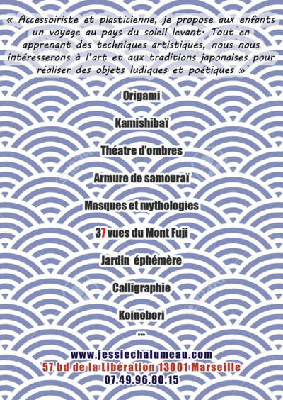 Mon objectif en ouvrant ses ateliers d’arts plastiques est de faire découvrir aux enfants un nouvel univers tout en leur apprenant différentes techniques plasticiennes. Le choix du Japon s’est imposé naturellement car c’est une source formidable d’inspiration tant son art et ses traditions sont riches.