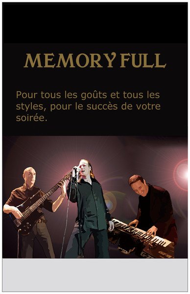37 Rue du moulin BaudrinSainte-Pazanne (44680)Né en 1987, Le groupe Memory Full de Loire-atlantique , orchestre de variétés professionnel, se produit dans les Casinos, Discothèques, Parcs de Loisirs, Soirées Privées (Mariages, Anniversaires, Comités d´Entreprises...). Fort de cette expérience, le groupe Memory Full de Loire-atlantique dispose donc d´un répertoire riche, varié et adapté à la danse, pour tous les goûts et tous les styles, et fera le succès de votre soirée. «...Variétés internationales, Reggae, Zouk, Rock FM, Hard Rock, Disco des années 70, 80, Funk, Rock ´n´ Roll des années 60, New Wave, Musette, Twist...»