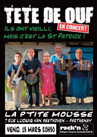 7 rue Ludwig Van BeethovenParthenay (79200)Les TÊTE DE OUF ! débute leur micro tournée "St PATRICK" à la P'TITE MOUSSE à PARTHENAY. Ce sera ROCK, Bières et Bonne Ambiance !