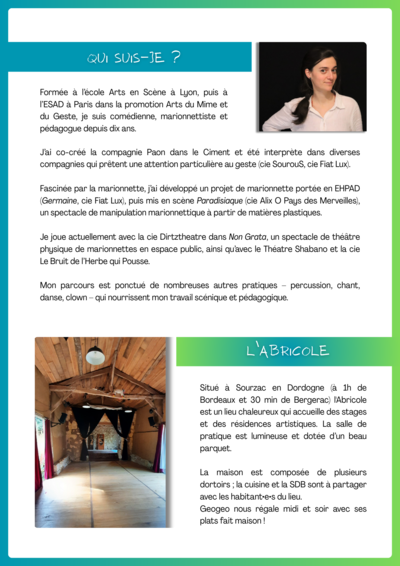 Sourzac (24400)Eléonore Gresset - comédienne, marionnettiste, pédagogue, notamment au sein des cie Paon dans le Ciment, Dirtztheatre, Théâtre du Shabano, Le Bruit de l'Herbe qui Pousse - propose cinq jours en immersion pour découvrir ou approfondir la manipulation de marionnettes portées.