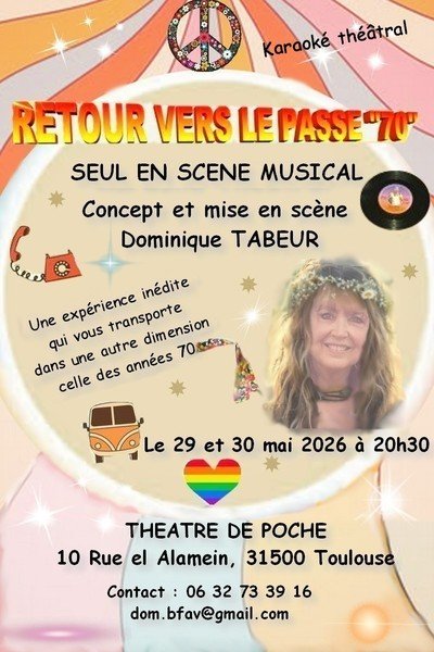 10 Rue el AlameinToulouse (31500)Les années70, Peace and Love. « Retour vers le passé 70 » est une expérience inédite qui vous transporte dans une autre dimension, celle des années 70. Dom vous fera voyager avec l’occasion de redécouvrir des chansons sur de grands standards.